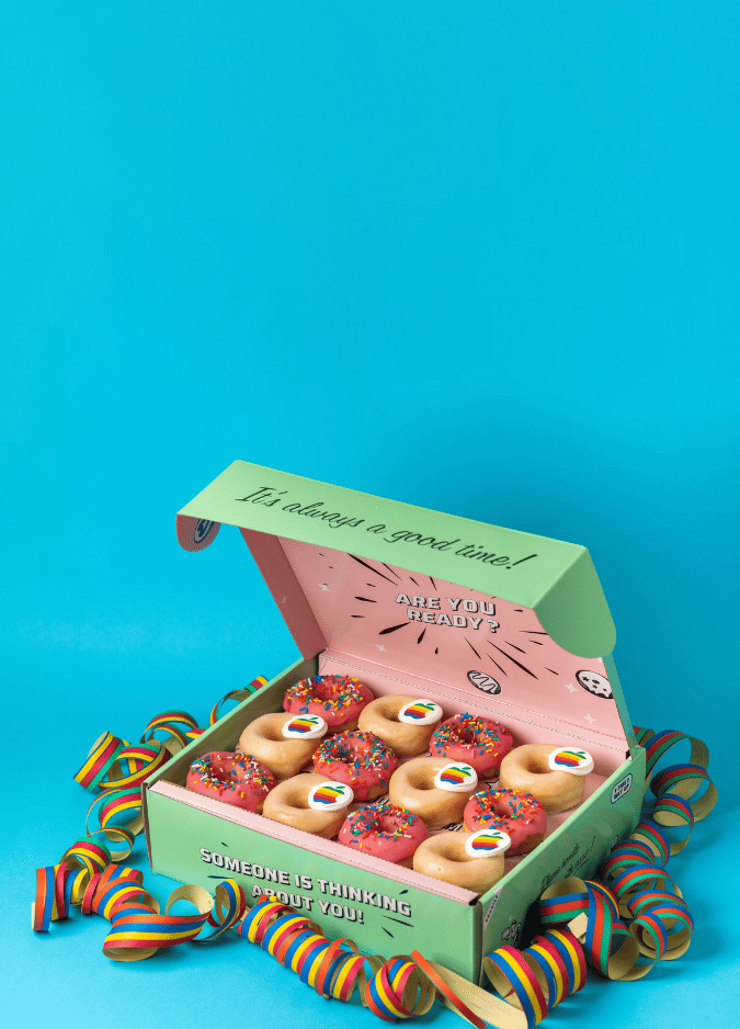 Gerne fügen wir den Donuts einen essbaren Topper mit ihrem Logo hinzu und passen die Farbe der Glasur an. Personalisierte Verpackung ist auch möglich.